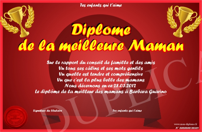 Envoyez par email votre Diplome de la meilleure Maman personalisé