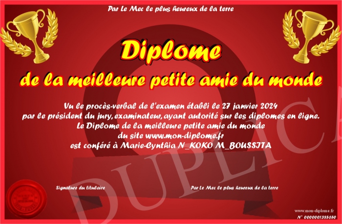 Envoyez par email votre Diplôme de la meilleure petite amie du monde personalisé