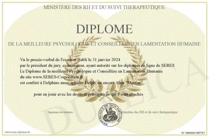 Envoyez par email votre Diplôme de la meilleure Psychologue et Conseillère en Lamentation Humaine personalisé