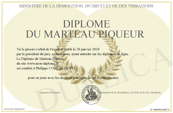 Envoyez par email votre Diplôme du Marteau Piqueur personalisé