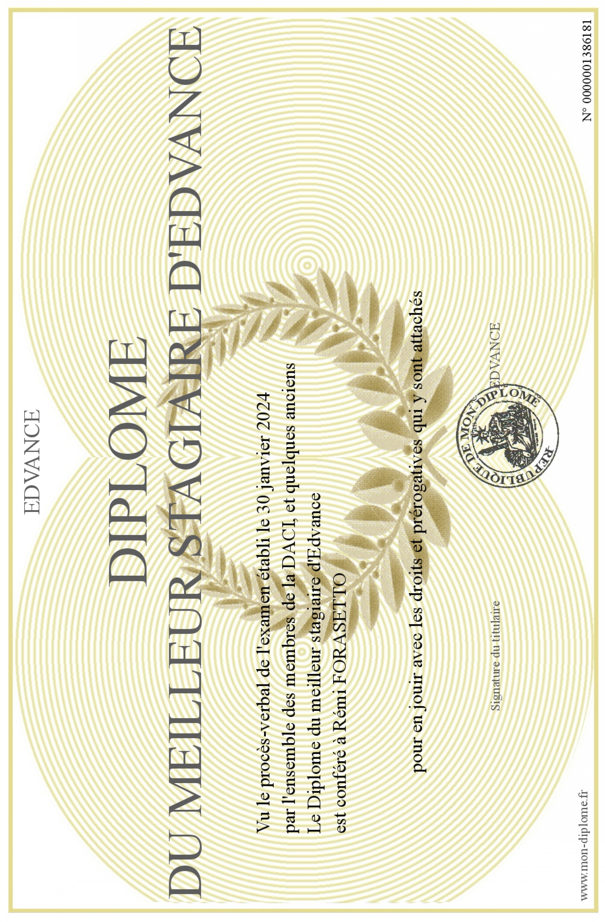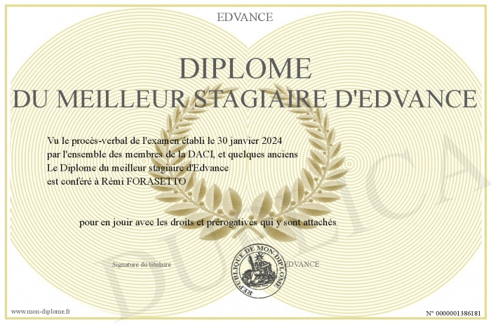 Envoyez par email votre Diplôme du meilleur stagiaire d'Edvance personalisé