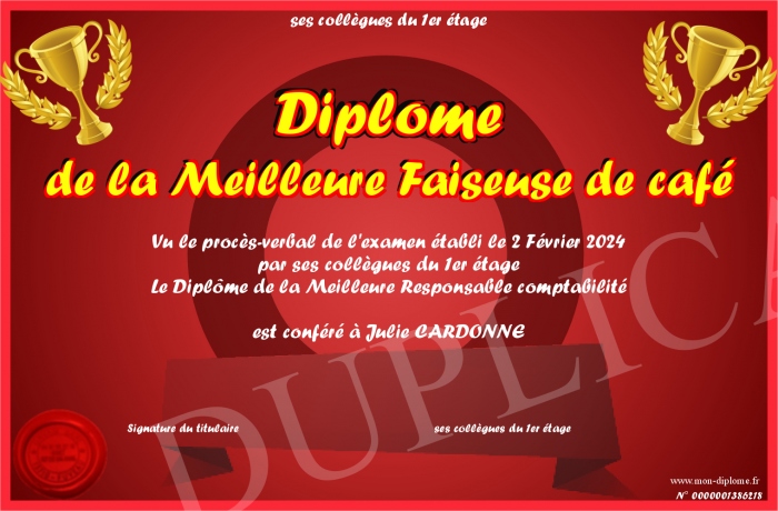 Envoyez par email votre Diplôme de la Meilleure Faiseuse de café personalisé