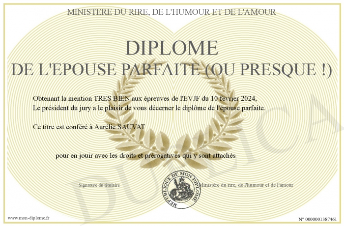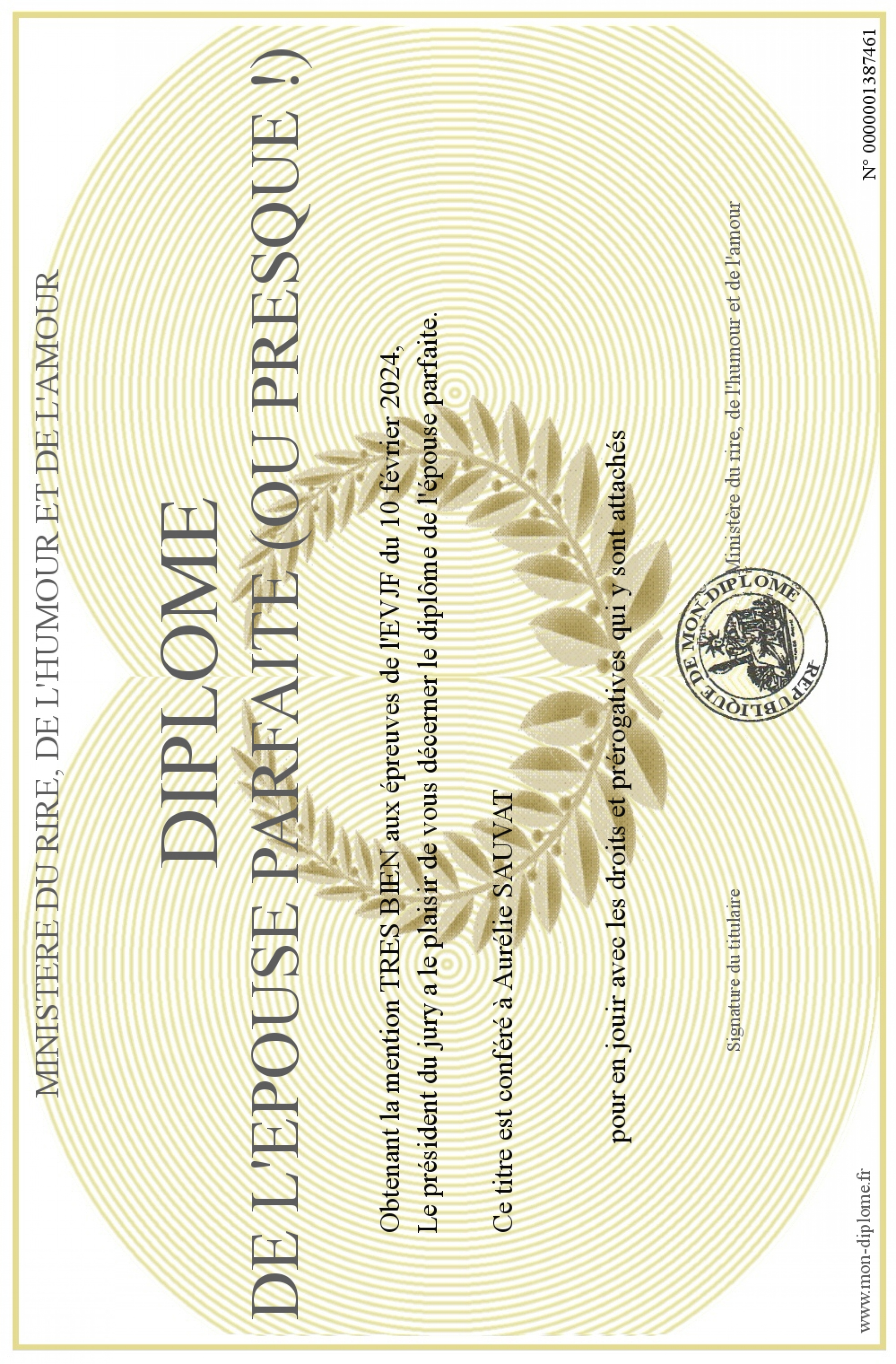 Envoyez par email votre Diplôme de l'épouse parfaite (ou presque !) personalisé