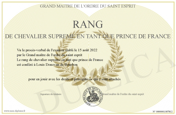 Envoyez par email votre rang de chevalier supreme en tant que prince de France personalisé