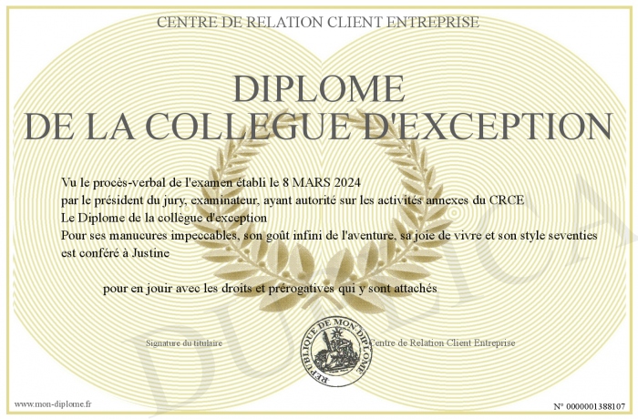 Envoyez par email votre Diplôme de la collègue d'exception personalisé