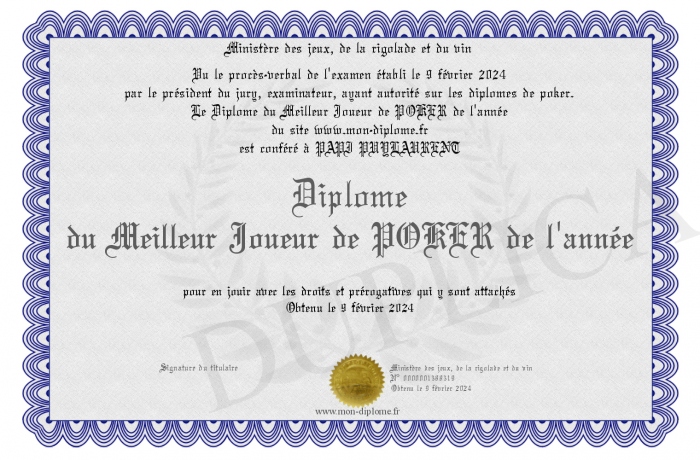Envoyez par email votre Diplôme du Meilleur Joueur de POKER de l'année personalisé