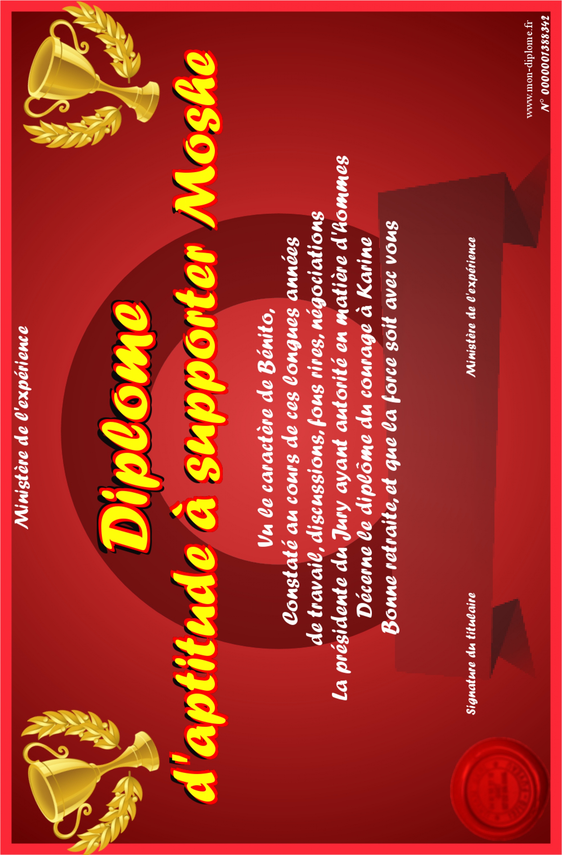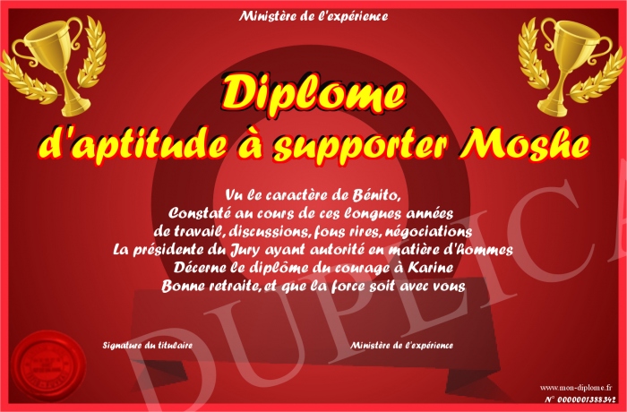 Envoyez par email votre Diplôme d'aptitude à supporter Moshe personalisé