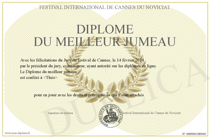 Envoyez par email votre Diplôme du meilleur jumeau personalisé