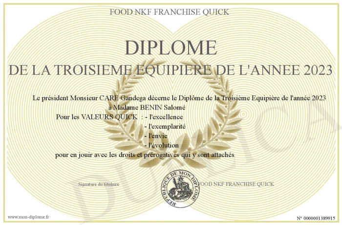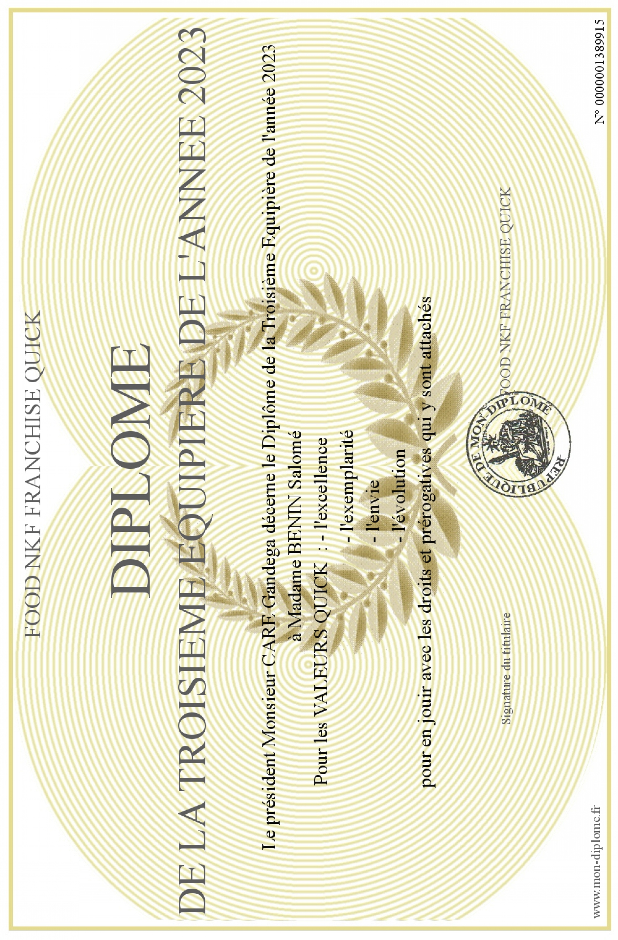 Envoyez par email votre Diplôme de la troisième équipière de l'année 2023 personalisé