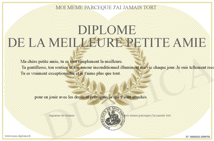 Envoyez par email votre Diplôme de la meilleure petite amie personalisé