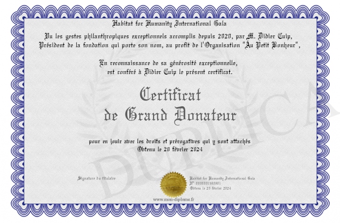 Envoyez par email votre Certificat de Grand Donateur personalisé