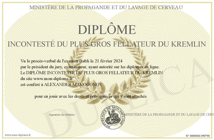 Envoyez par email votre DIPLÔME INCONTESTÉ DU PLUS GROS FELLATEUR DU KREMLIN personalisé