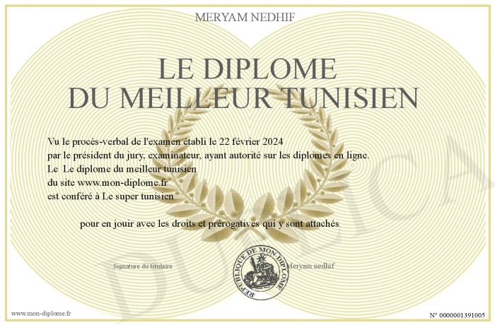 Envoyez par email votre Le diplôme du meilleur tunisien personalisé