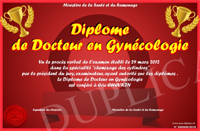 Envoyez par email votre Diplôme de Docteur en Gynécologie personalisé