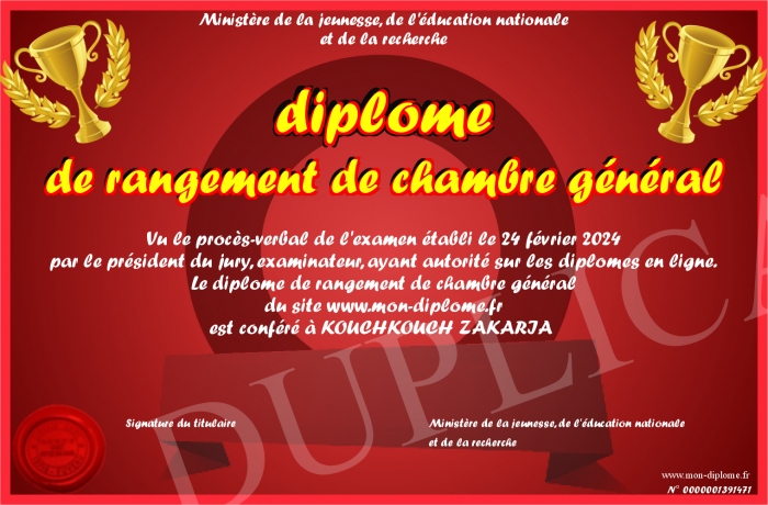 Envoyez par email votre diplôme de rangement de chambre général personalisé