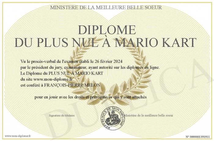 Envoyez par email votre Diplôme du PLUS NUL À MARIO KART personalisé