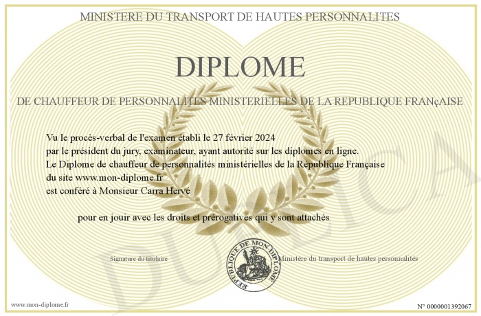 Envoyez par email votre Diplôme de chauffeur de personnalités ministérielles de la République Française personalisé