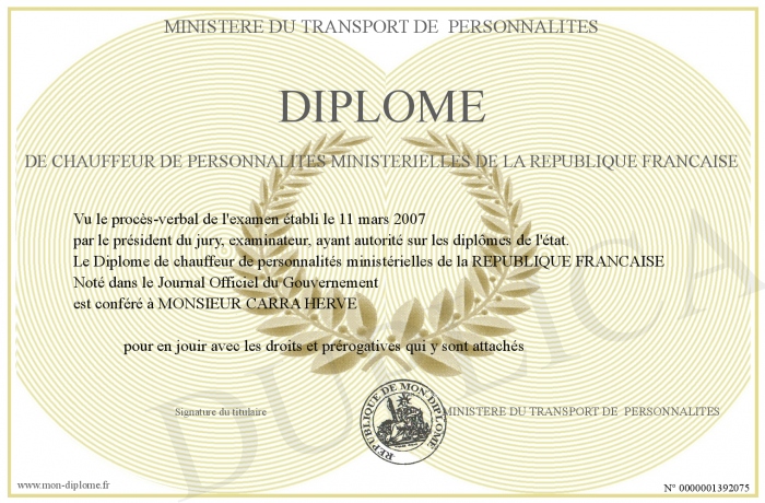 Envoyez par email votre Diplôme de chauffeur de personnalités ministérielles de la REPUBLIQUE FRANCAISE personalisé