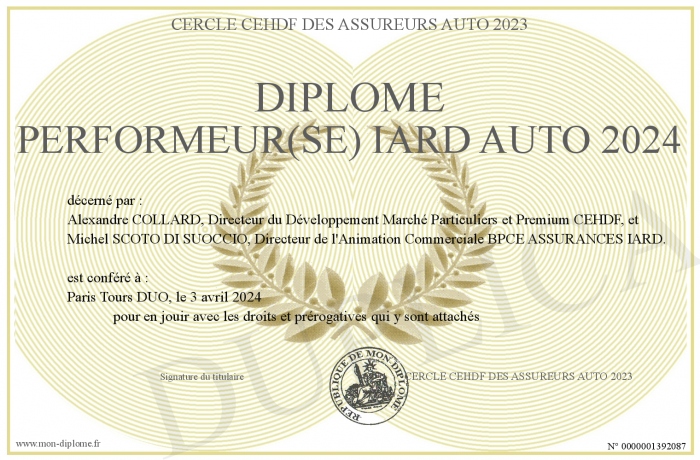 Envoyez par email votre Diplôme Performeur(se) IARD AUTO 2024 personalisé