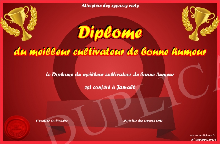 Envoyez par email votre Diplôme du meilleur cultivateur de bonne humeur personalisé