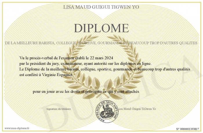 Envoyez par email votre Diplôme de la meilleure barista, collègue, sportive, gourmande et beaucoup trop d'autres qualités personalisé