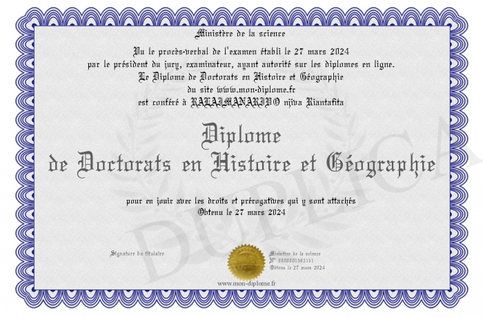 Envoyez par email votre Diplôme de Doctorats en Histoire et Géographie personalisé