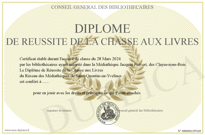 Envoyez par email votre Diplôme de Réussite de la Chasse aux Livres personalisé
