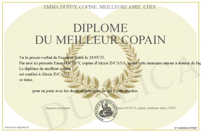 Envoyez par email votre Diplôme du meilleur copain personalisé