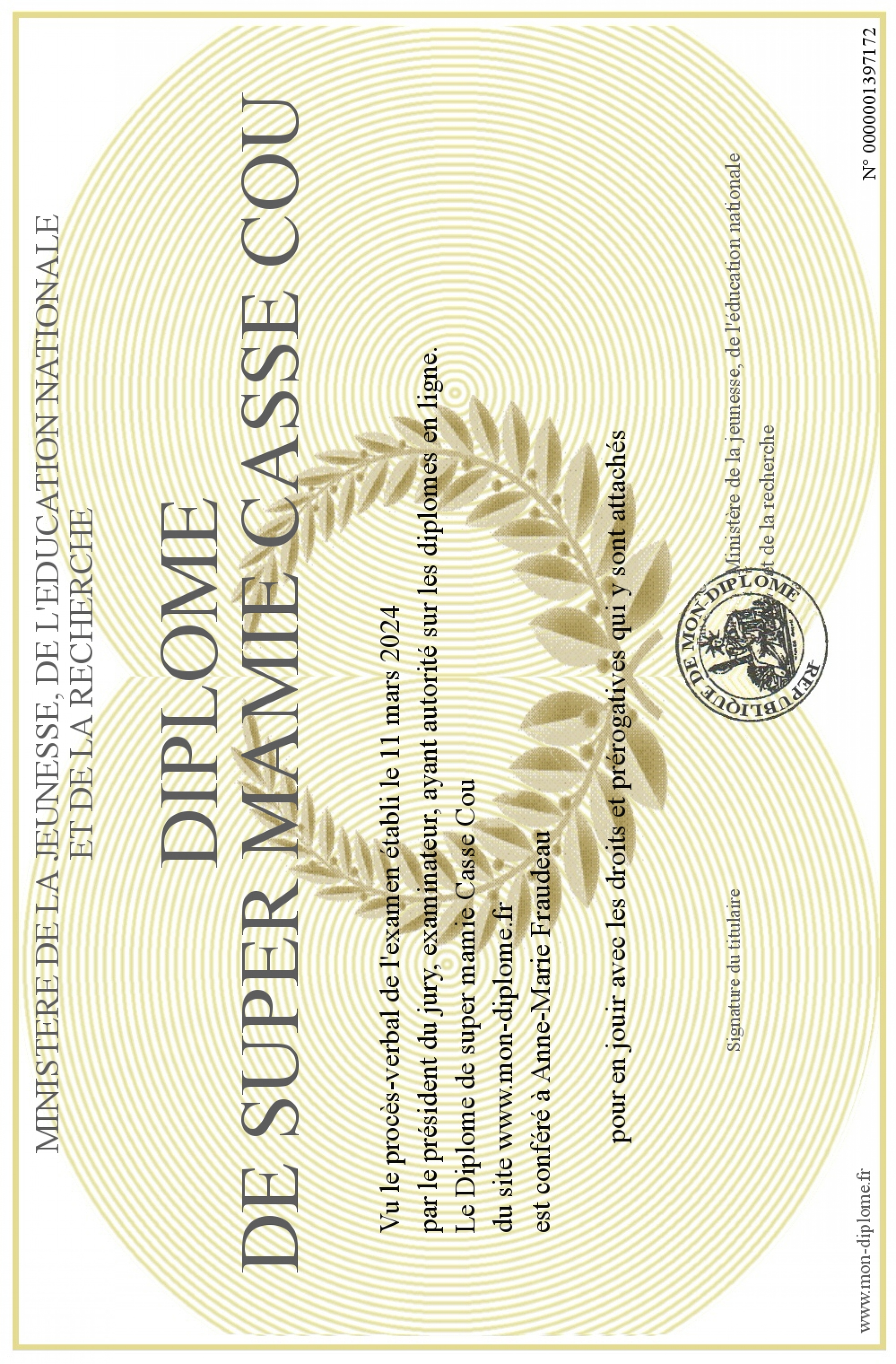 Envoyez par email votre Diplôme de super mamie Casse Cou personalisé