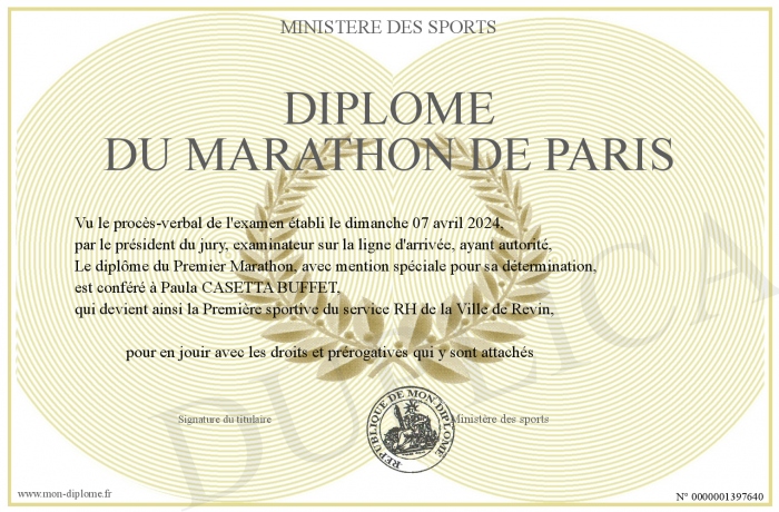 Envoyez par email votre Diplôme du Marathon de Paris personalisé