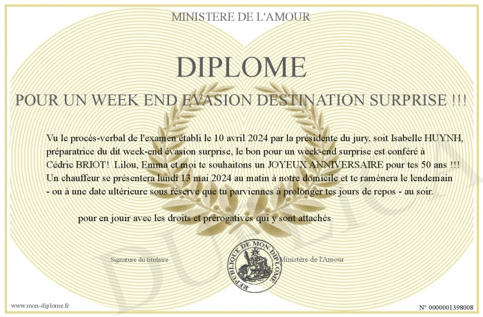 Envoyez par email votre Diplôme pour un week end évasion destination surprise !!! personalisé