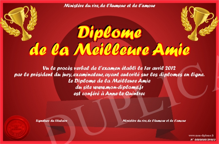 Envoyez par email votre Diplôme de la Meilleure Amie personalisé