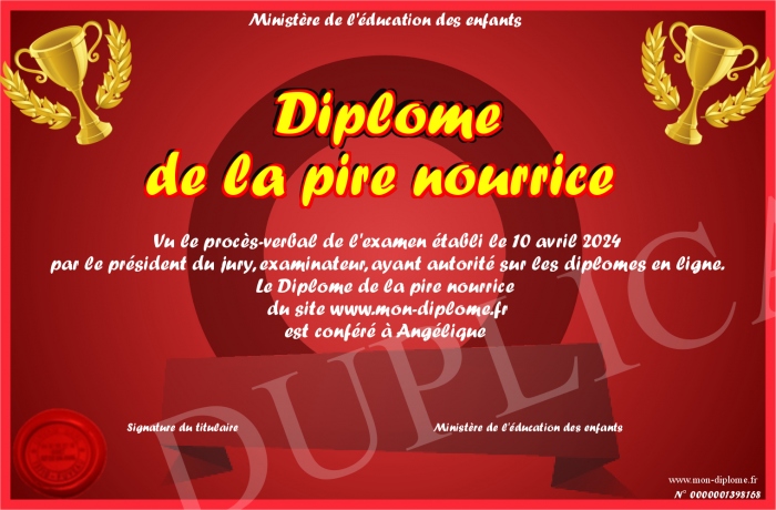 Envoyez par email votre Diplome de la pire nourrice personalisé