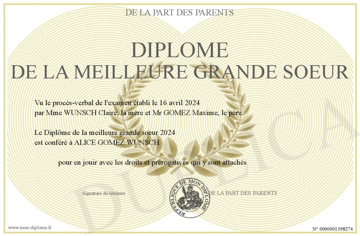 Envoyez par email votre diplome de la Meilleure Grande Soeur personalisé