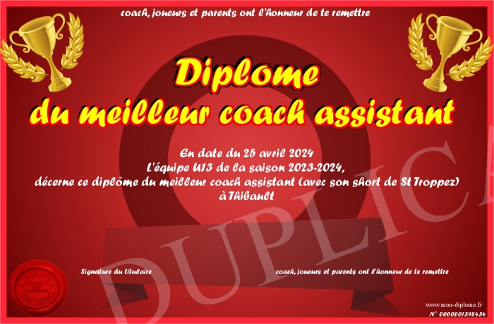 Envoyez par email votre Diplôme du meilleur coach assistant personalisé