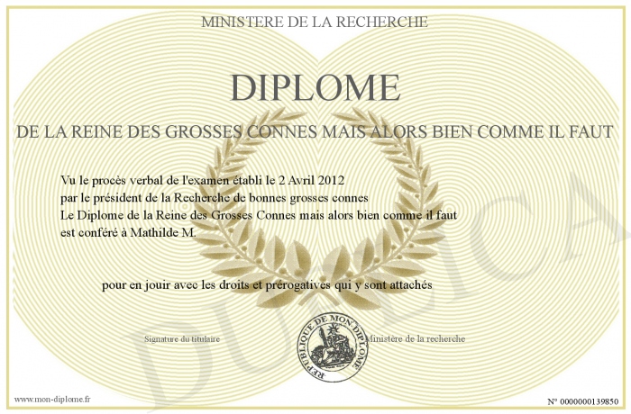 • Diplôme de la Reine des Grosses Connes mais alors bien comme il faut