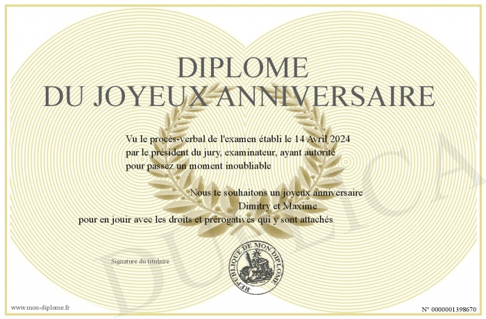 Envoyez par email votre Diplôme du joyeux anniversaire personalisé