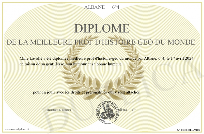 Envoyez par email votre diplome de la meilleure prof d'histoire geo du monde personalisé