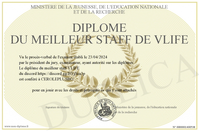 Envoyez par email votre Diplôme du meilleur staff de Vlife personalisé