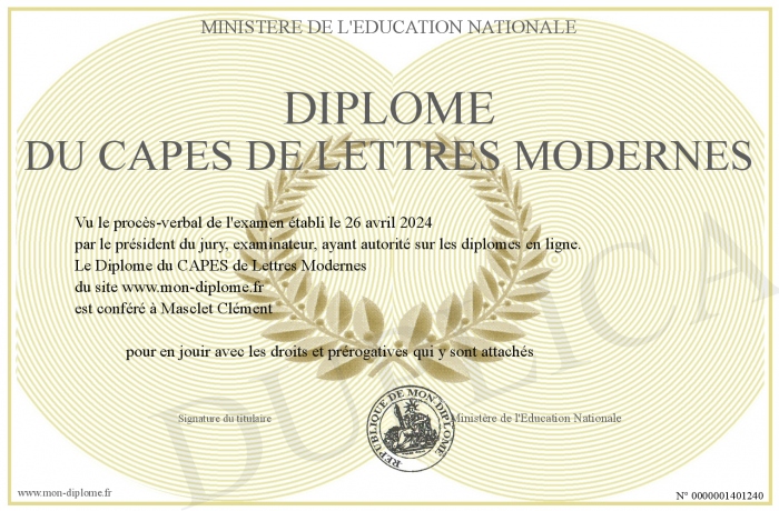 Envoyez par email votre Diplôme du CAPES de Lettres Modernes personalisé