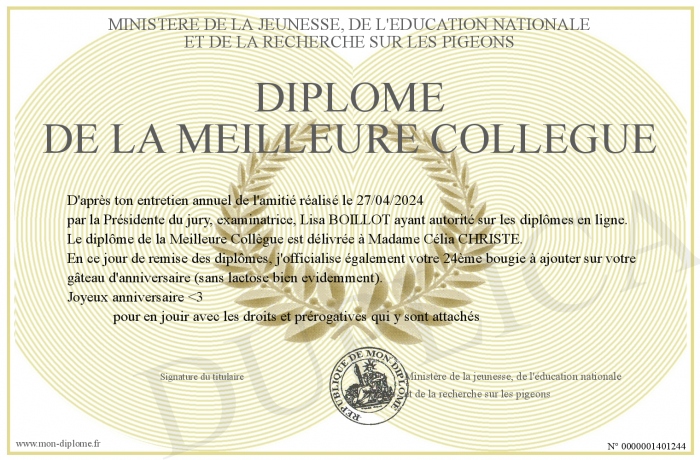 Envoyez par email votre Diplôme de la Meilleure Collègue personalisé