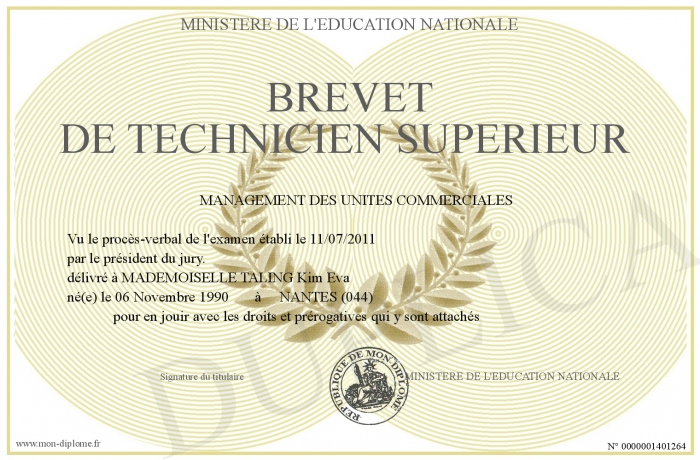 Envoyez par email votre Brevet de Technicien Superieur personalisé