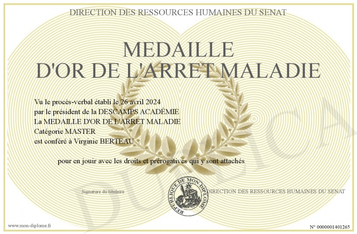 Envoyez par email votre MEDAILLE D'OR DE L'ARRET MALADIE personalisé