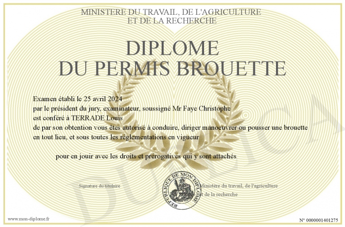 Envoyez par email votre Diplôme du permis brouette personalisé