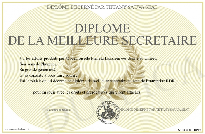 Envoyez par email votre Diplôme de la meilleure secrétaire personalisé
