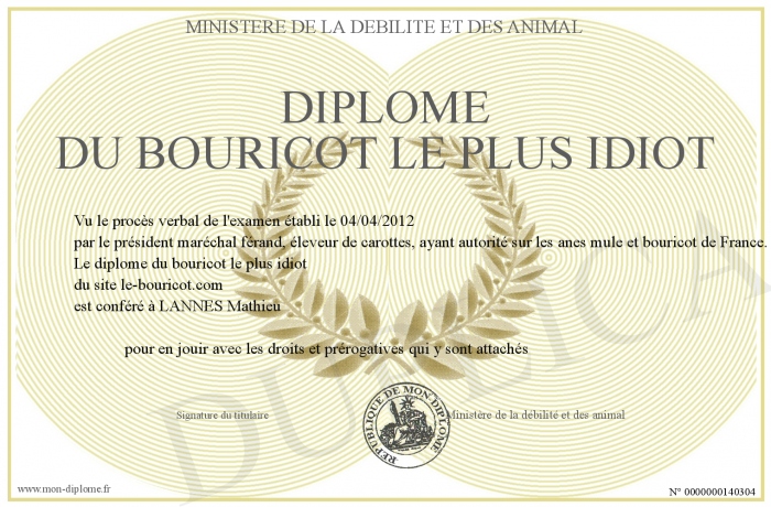 Envoyez par email votre diplôme du bouricôt le plus idiot personalisé