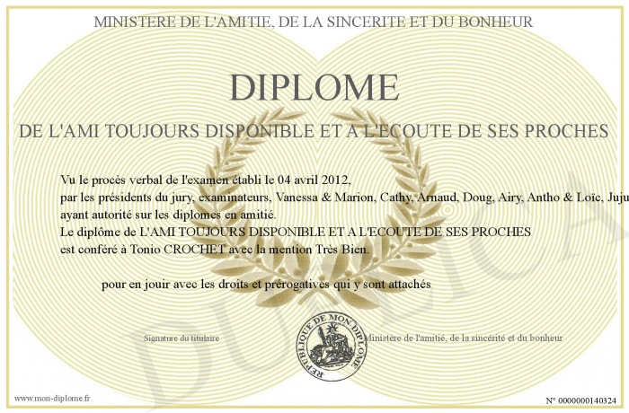 Envoyez par email votre Diplôme de L'AMI TOUJOURS DISPONIBLE ET A L'ECOUTE DE SES PROCHES personalisé