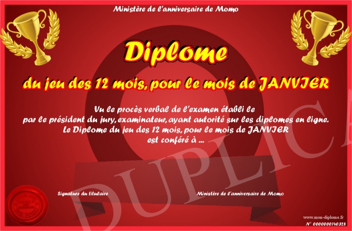 Envoyez par email votre Diplôme du jeu des 12 mois, pour le mois de JANVIER personalisé
