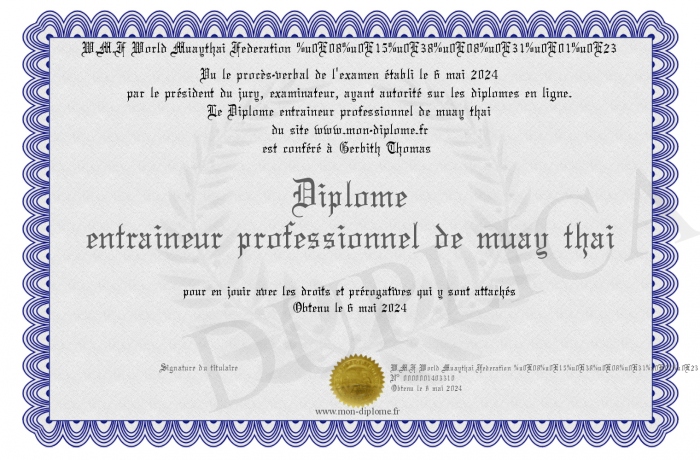 Envoyez par email votre Diplôme entraineur professionnel de muay thai personalisé