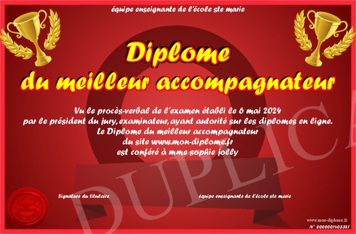 Envoyez par email votre Diplome du meilleur accompagnateur personalisé